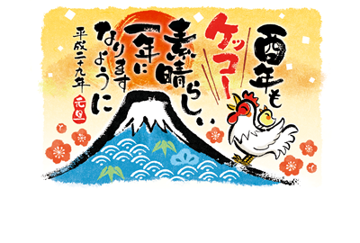「ケッコー素晴らしい一年に」とはなかなか洒落がきいていますよね!水彩絵の具で描いたような優しい色彩に力強い線が目を引きます。もし自分が貰ったら壁に貼っておきたくなるような素敵な年賀状です。