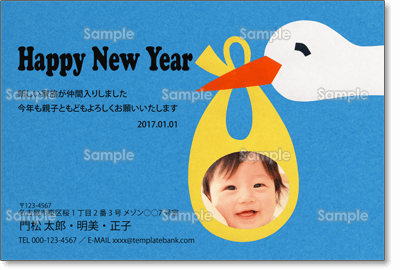 これもアイディアが素敵な年賀状です。赤ちゃんが生まれたら、ぜひとも年賀状で報告せねば!ですよね。そう、赤ちゃんを運んでくるのも鳥でした。見てるだけで幸せになるコウノトリのにっこり顔と、あなたの赤ちゃんの写真を組み合わせて作っちゃいましょう!